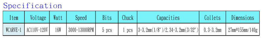 | Product Model: WCARVE-1 The new pen-type grinder, Japanese movement design Motor long life, and exported to Japan, European and American models special Three-jaw chuck design, folder 0 ~ 3.2mm Shank Diameter Market engraving head polishing head, grinding head with Handle silicon Li Kang wheel, drill bits, Roller sharpening, grinding wheel rod .....etc. Use of voltage: AC100 ~ AC120V, widely applicable domestic and international Around |