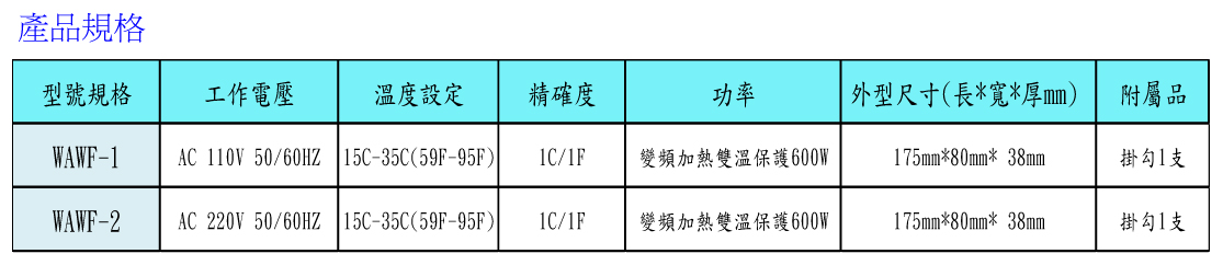 1.新型專利缸內缸外兩溫度SENSOR控制. 2.600W變頻雙溫保護加熱. 3.兩溫度控制可避免加熱器失控之現像產生(煮魚湯). 4.C/F 之切換功能適合多國使用. 5.採用高精準切斷加熱電源開關負戴保險絲,確保使用安全. 6.溫度感溫器防水包覆、抗老化,雙重防水絕緣保護. 7.穩定性最高之機型,不會對其他電子物品產生電磁場干擾. 8.輕巧超薄,安裝固定簡單 .
